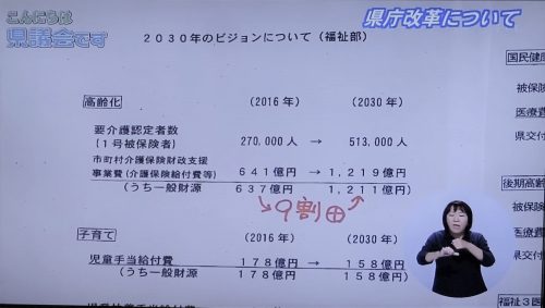 『2030年の【介護】の県庁支出額が昨年の9割増』(予想)というもの。