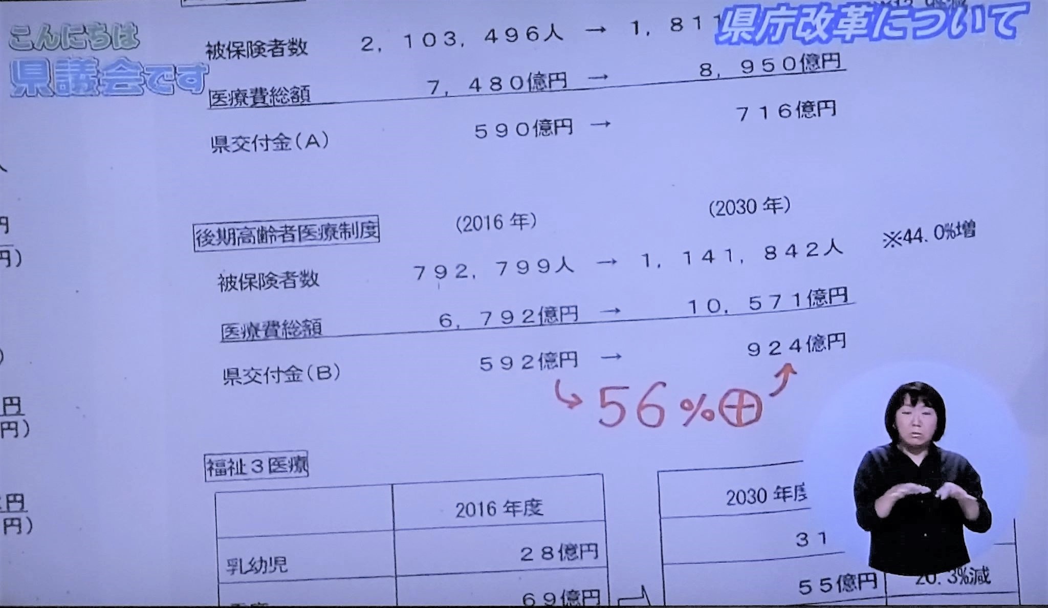 『2030年の【高齢者医療】の県庁支出額が昨年の56%増』という資料。