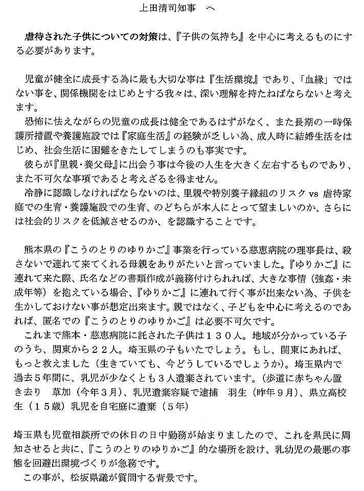 東松山市で『少年殺害事件』もあり、熊本【赤ちゃんポスト】で現場研修を受け、県議会『改革の会』で今日、上田知事に提言した文書を、是非ぜひ、ご覧下さい!!