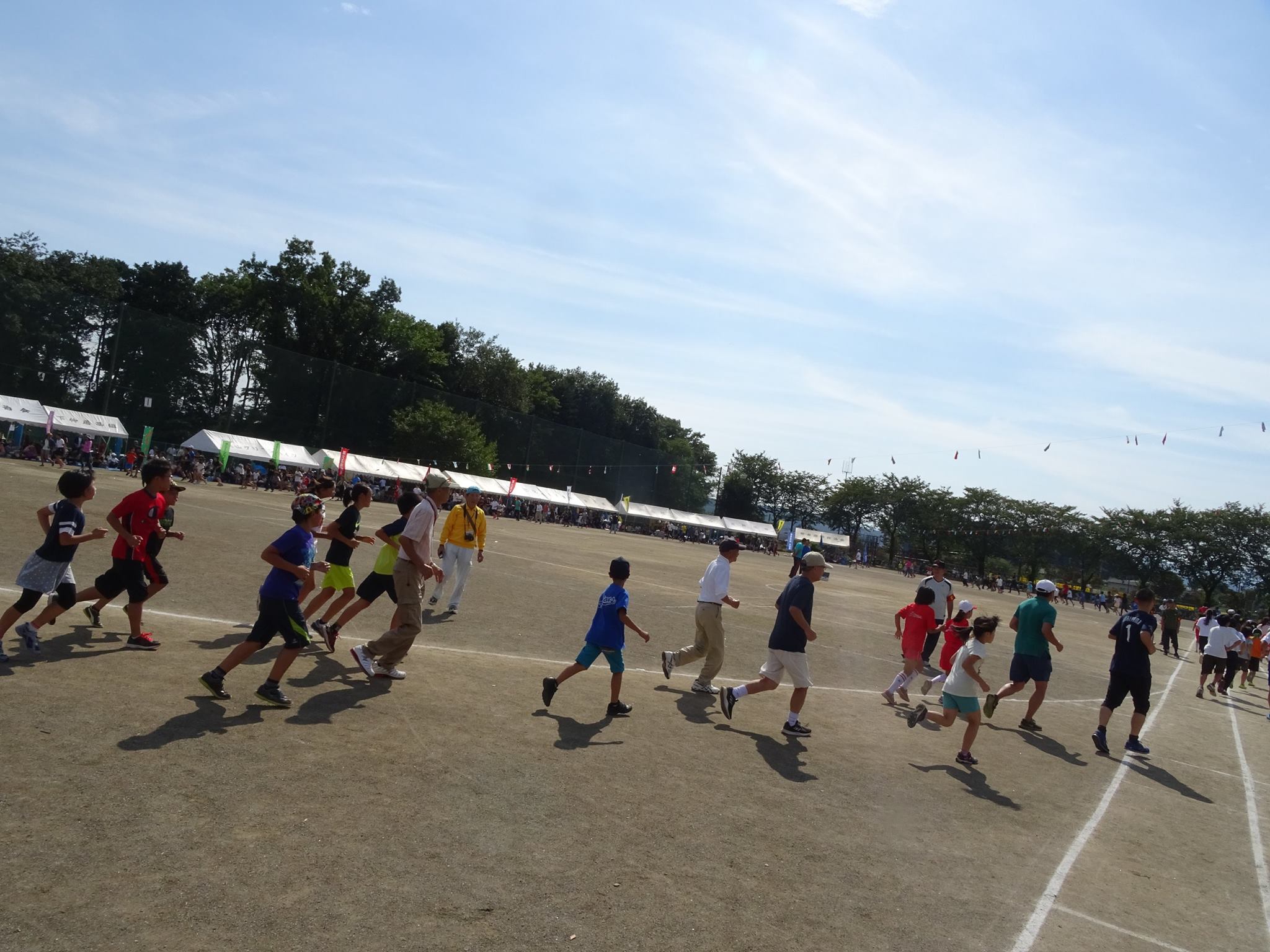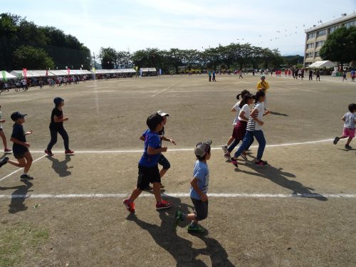 他に、ママを置いてけぼりで疾走する子や、走ってて急に砂遊び始めちゃう子(トラック内で)や、パパさんと泣きながら走る子もいました。(^^)