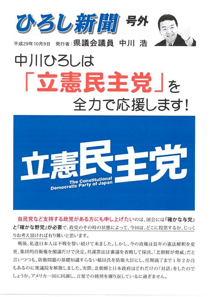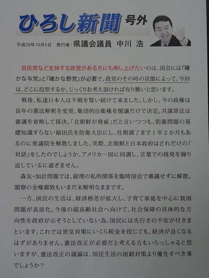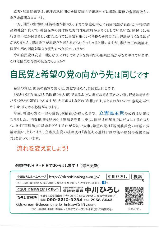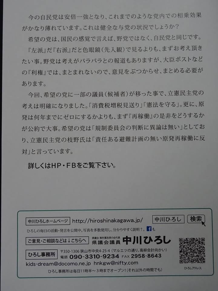 折り込みの場合、選挙前は内容に制限があり、駅前などで配ったものと異なります。以下(コメント欄)が、駅前バージョンですので、そちらと読み比べて頂ければ幸いです。