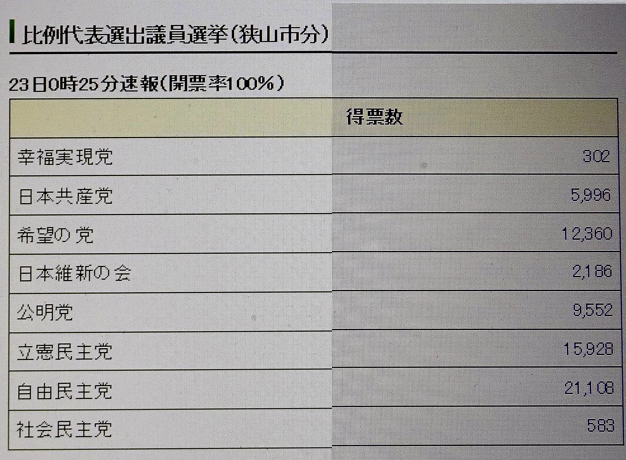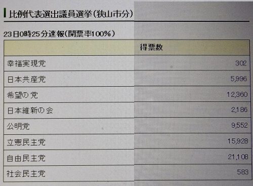 「開票結果【衆議院比例代表選出議員選挙】」- 飯能市オフィシャルサイト