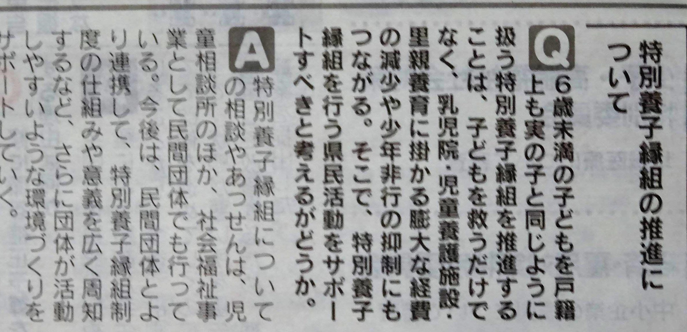 里親を増やす目標値を今年掲げた県庁ではあるが、里親・『養子縁組』をどう増やすかの手立てを、この半年打ち出していない。
