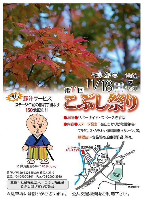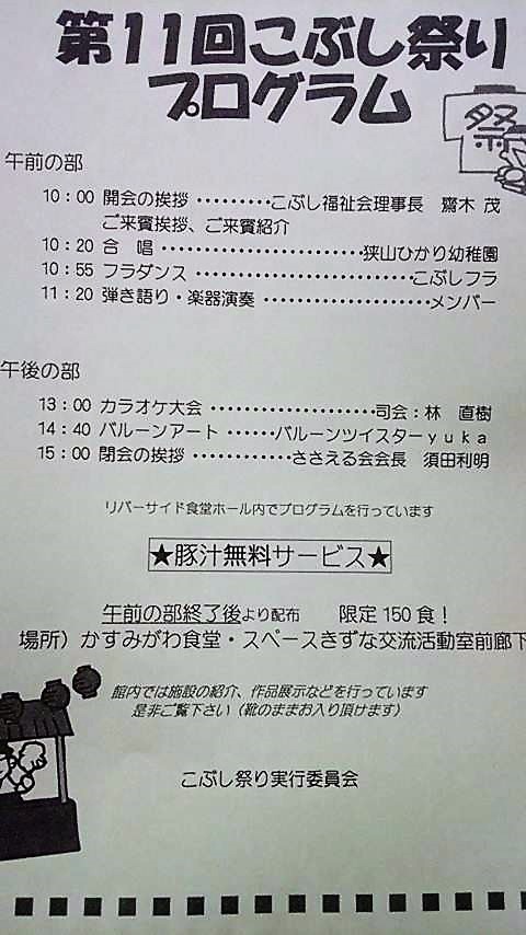今日(土)、障害者施設 こぶし福祉会のお祭り開催中。2時40分からは『バルーンアート』。 入間川中学校の通りの突き当たり。