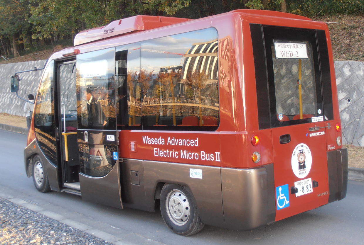 次世代モビリティ・エリアマネジメント研究会(37社)において、電動マイクロバスを開発・実用化している。電動バスは通常、バッテリーの大きさで4~6人分の乗車スペースを取り、1.5倍の費用がかかる。そこで、500万円のバッテリーで25キロ走れるバスを開発。IHクッキングヒーターの原理と同じ仕組みで、充電場所に車を置けばコードいらずで充電できるシステムを開発。充電装置とバス(車)との間が14cm空いていても充電が可能。実際に電動バスに乗せて頂き(とても静か)、充電ステーションを見させて頂きました。