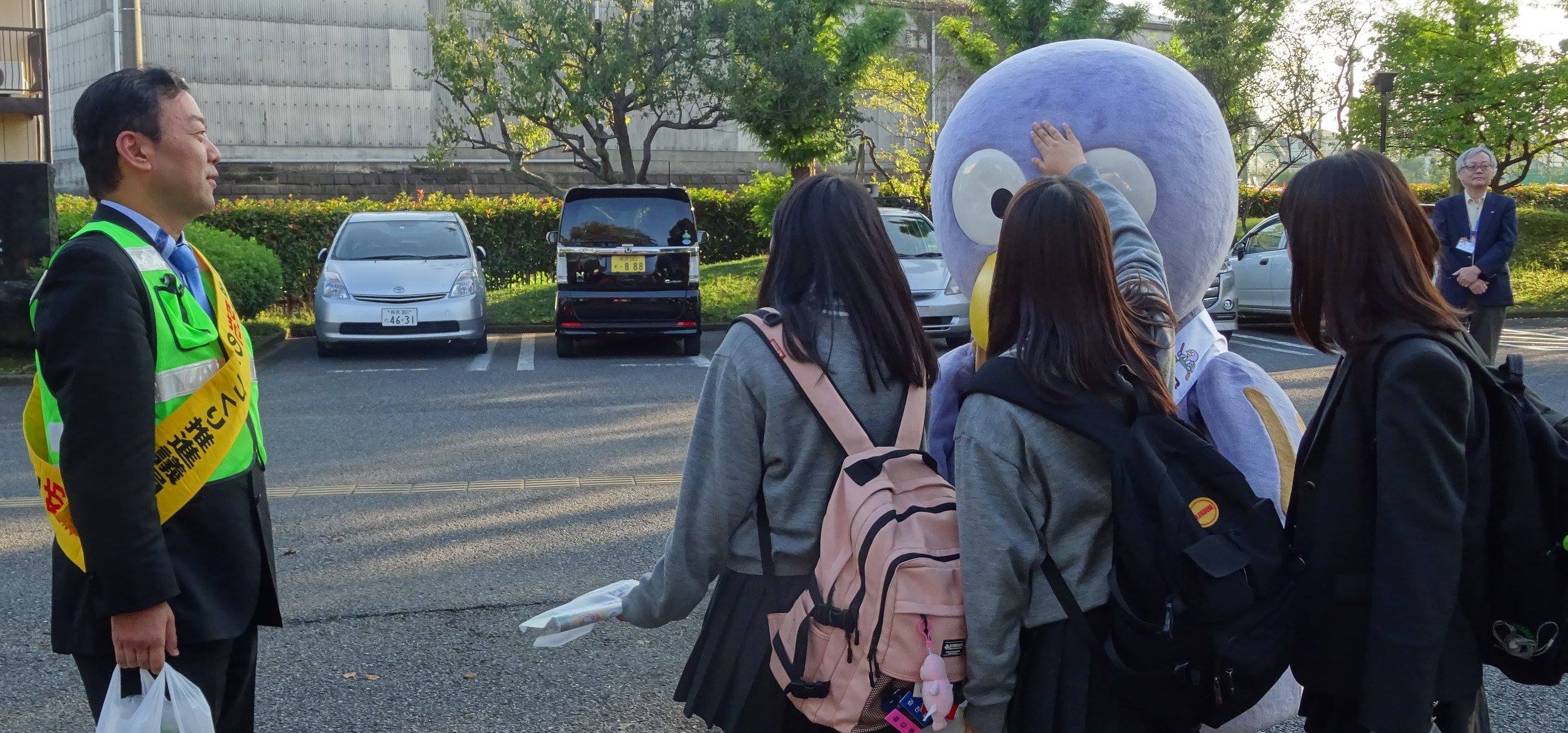 県の防犯活動で、私の服装がダサいですが、自転車の鍵などを高校生に配りました。