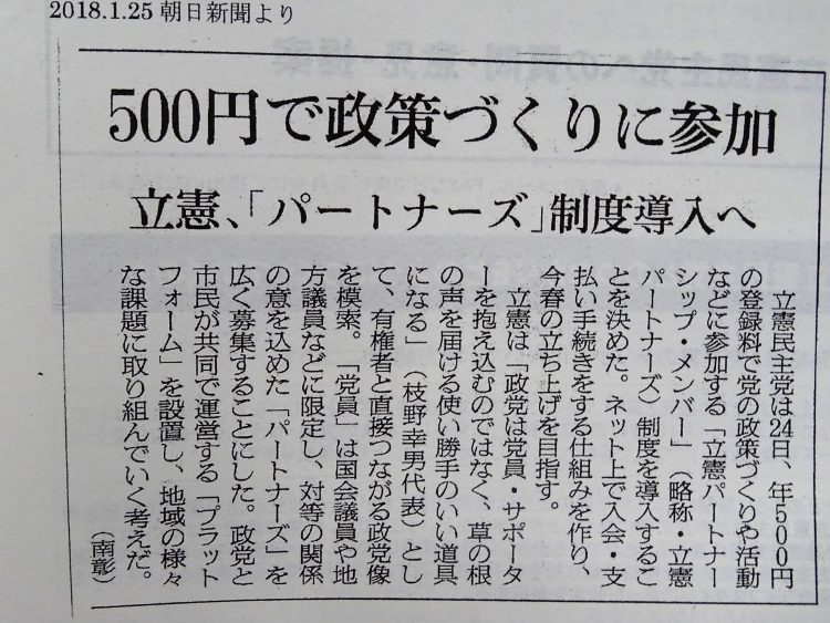 「暮らしに根差したボトムアップ型の政治を取り戻していきたい。それは私自身の強い反省も込めて、永田町の論理だった。これまでの政治は、政党から皆さんをどう巻き込むか。私達の発想は逆。いかに使い勝手がいいか。私達は道具。個々具体的な政策に賛同して頂くのでなく、綱領に賛同して頂ける方(個々の政策の考えは違っても)。立憲民主党の『パートナー』費用500円は、タダにしたかったが、実費相当。収益にならない。それに加えてご寄付を頂ける方は、お願いしたい。もちろん政党側からもアプローチをしていきたいが、それだけでは足らない。『こういう企画があるから、来い』というのが実現出来るかがポイント。『つながる本部』が『市民政調』のバージョンUP版。地域や、全国的なネットワークとも、双方向で、つながっていく。自信は無いが、やっていきたい。第1弾で、原発ゼロ法案の各地方でタウンミーティングを行っているが、高齢者福祉・貧困問題などや、目的を定めずにも、相反する事も、やってきたい。意見の違う事を、知らないで、見ないで、決めるのとは違う。