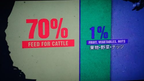 アメリカの国土面積の47%が食糧生産に使われ、その7割が牛のエサの生産だけに使われ、人間が直接食べる野菜・果物・ナッツ類は1%。