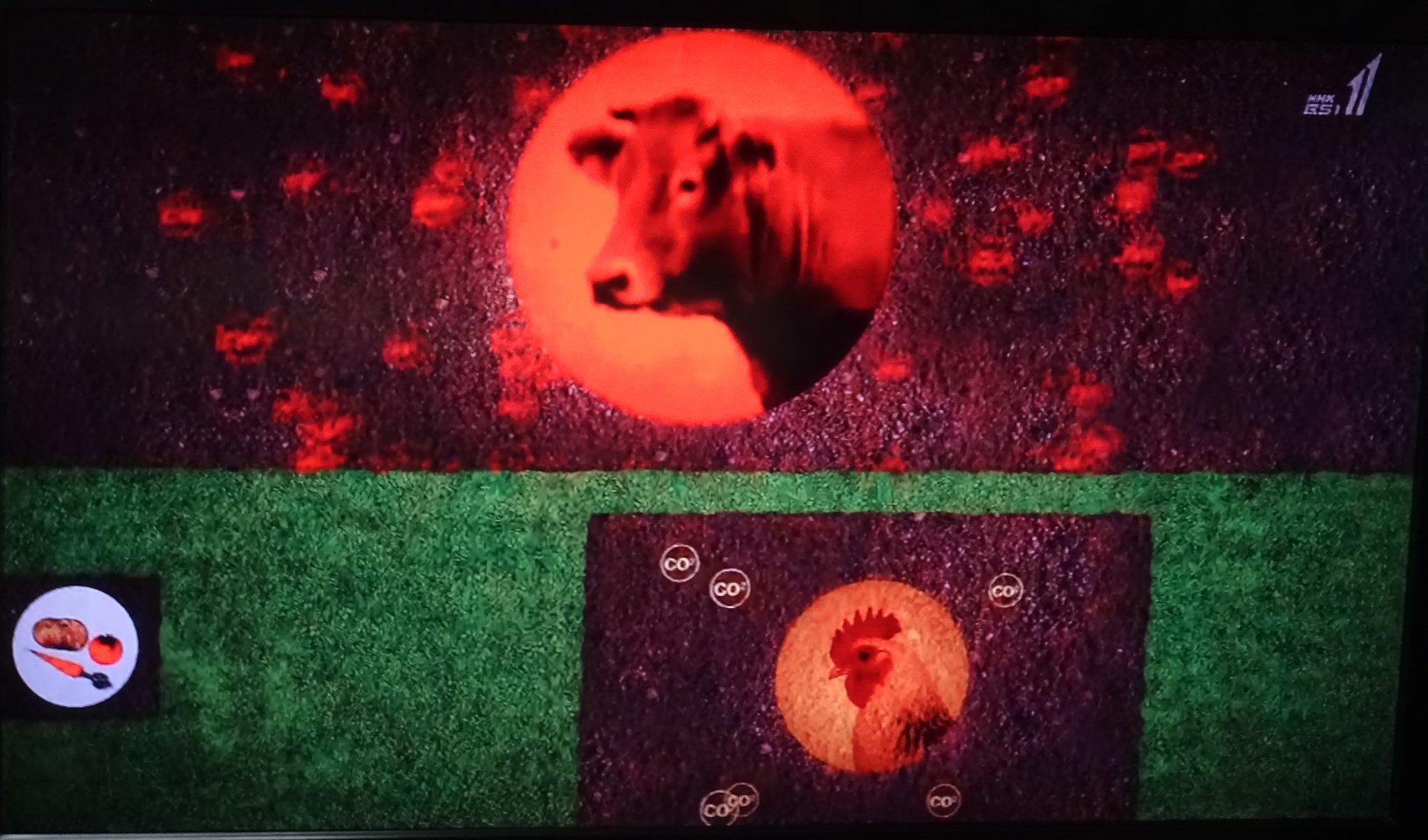 (↓写真)鶏肉の生産での温暖化ガス排出は、牛肉の生産の1割(土地利用で2割)。
