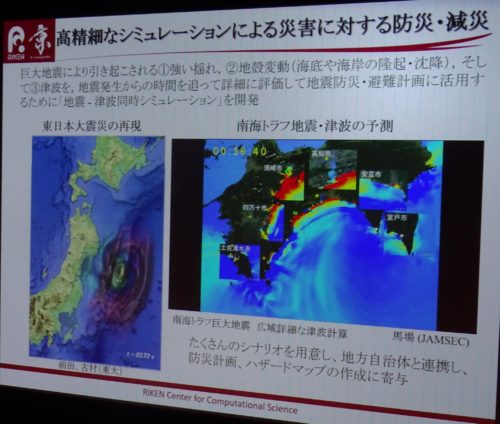 2015~2017年 世界1位。現在は10位。179社の企業が利用。企業のニーズに合わせ、理化学研究所もソフトを共同で開発する事も、メーカー同士が開発を共同で”途中まで”行う事もあるとの事。京は8万CPU、国際入札で富士通が開発。