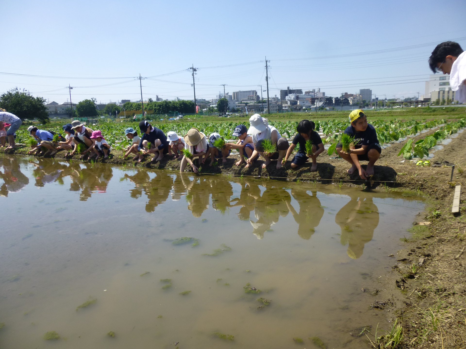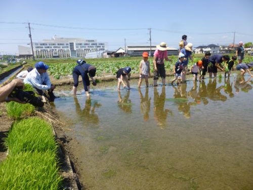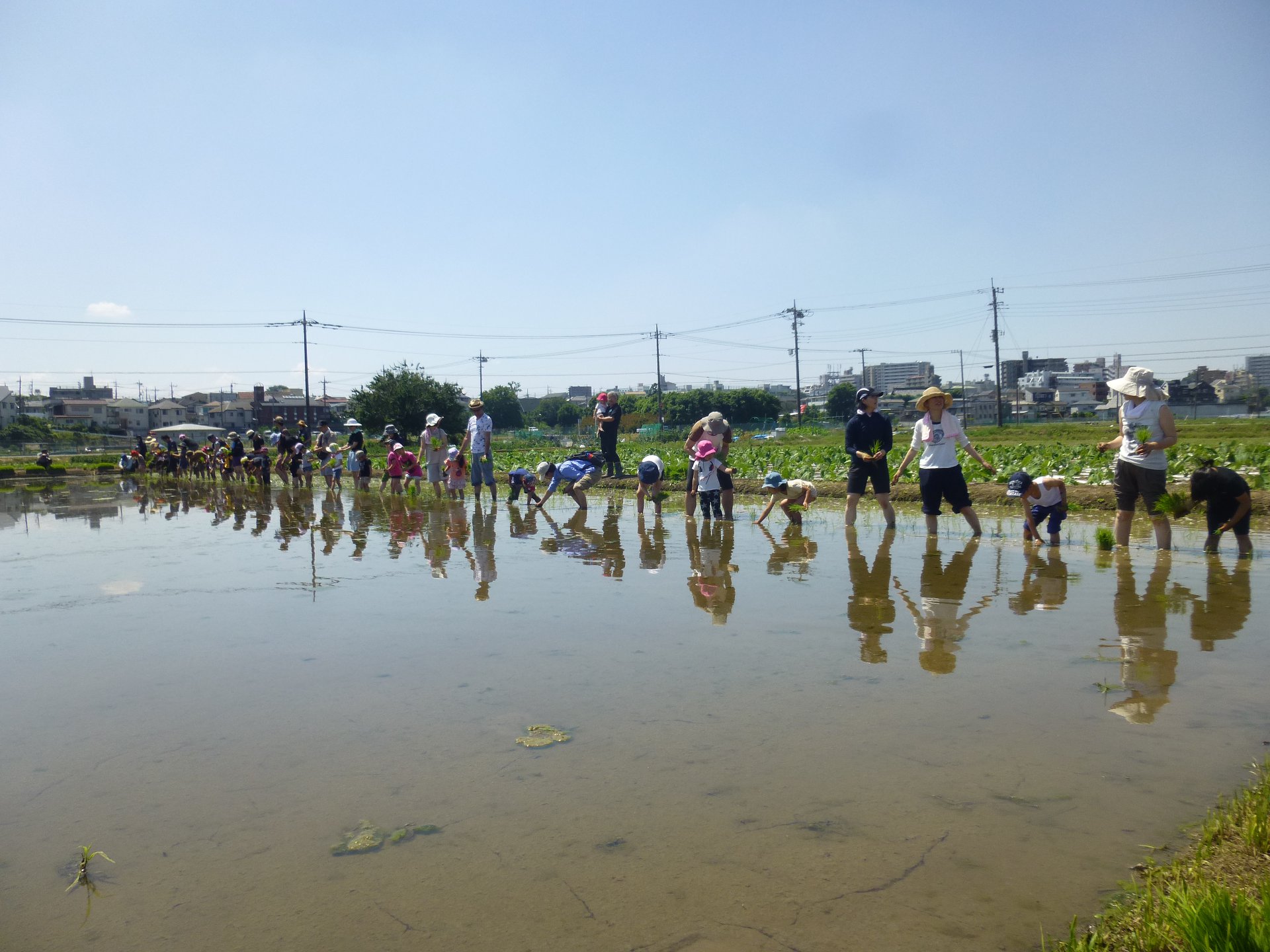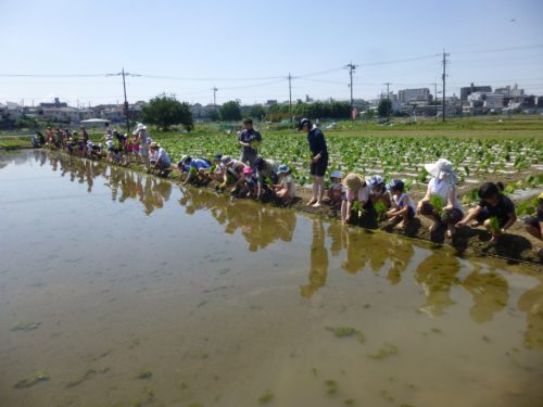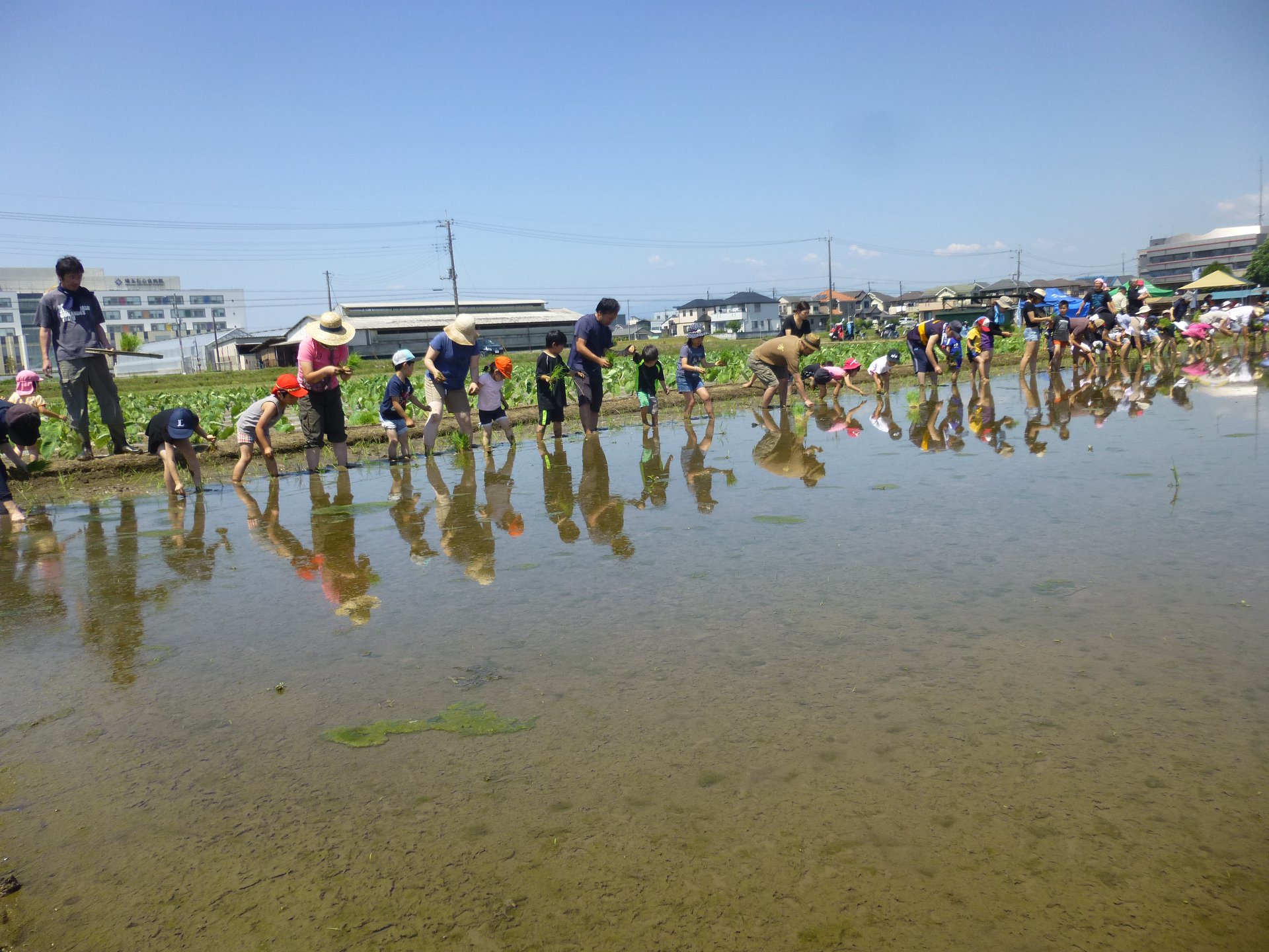 写真は、ちぴっ子とママ・パパさん達が今日植えた田んぼ。