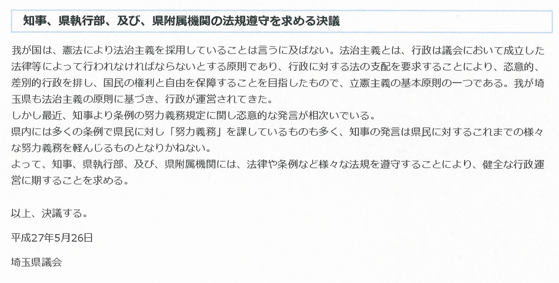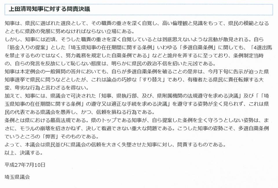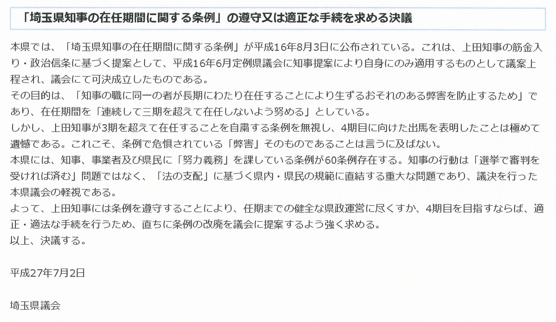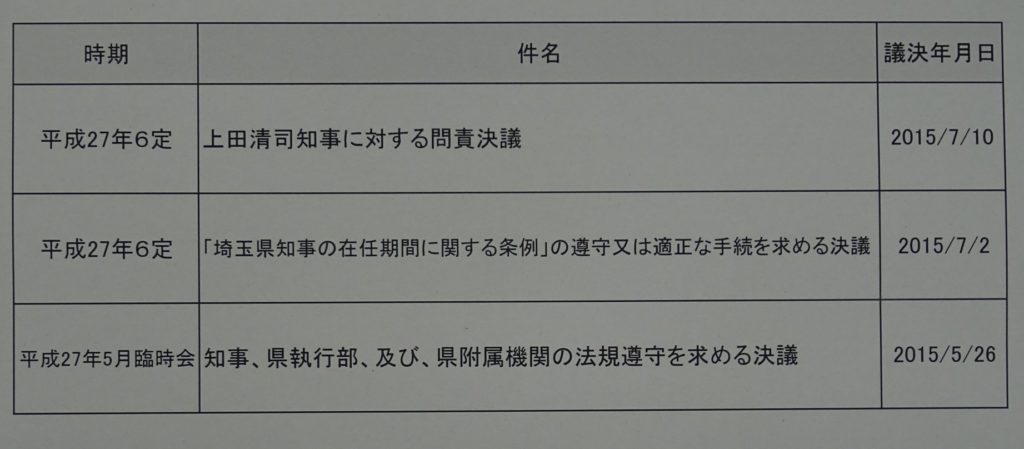 埼玉県知事の『多選自粛【条例】』が守られなくなってから約3年、県議会で可決された過去3回の決議(写真)。