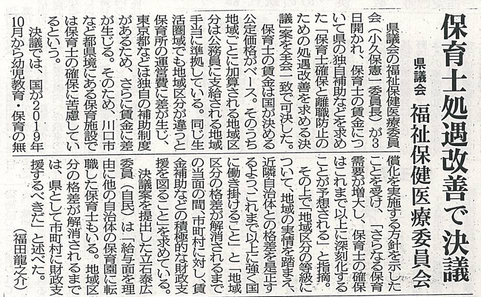 【保育士 足らない問題】 県議会、全員の協力で、『困っている県民』の問題を前進させる事が出来た💛。感謝😊。 (写真は、埼玉新聞4日)