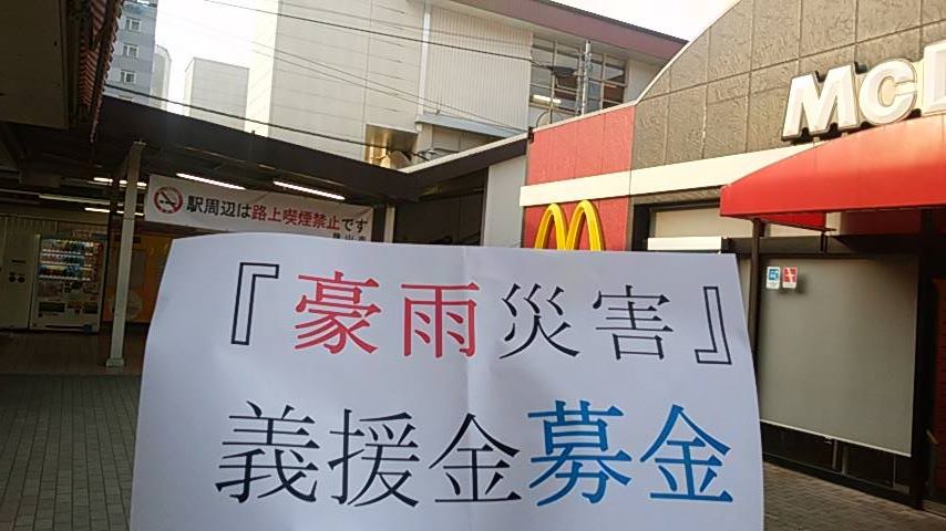 西日本豪雨災害義援金募金、今朝(火)【新狭山駅】で行い、夜も行う予定です。