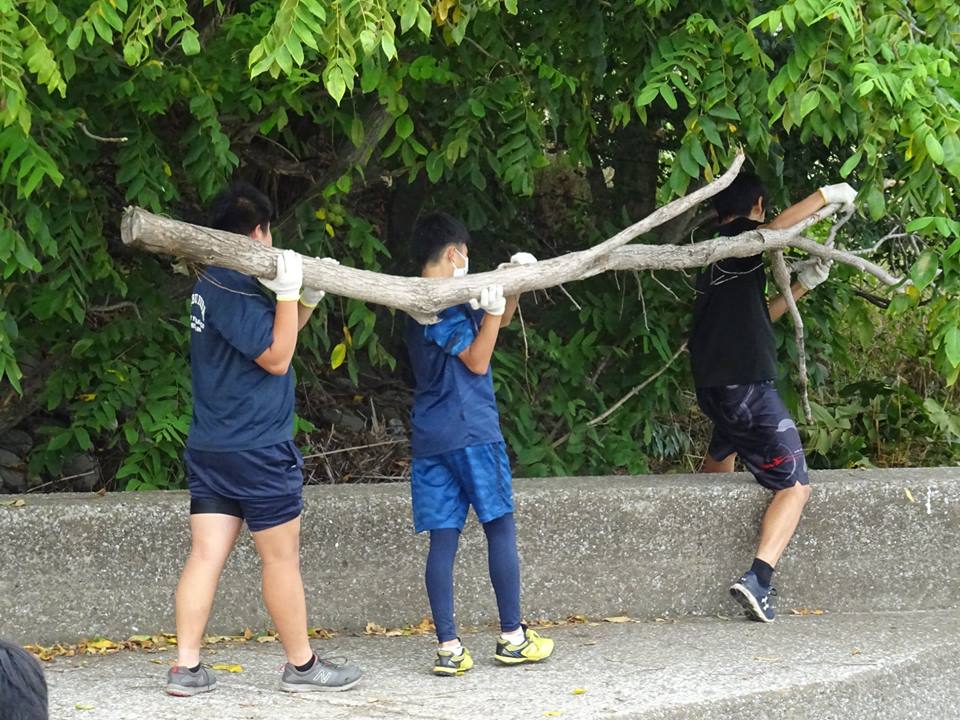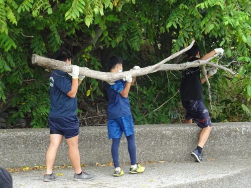 長い流木を、高校生が運ぶ。