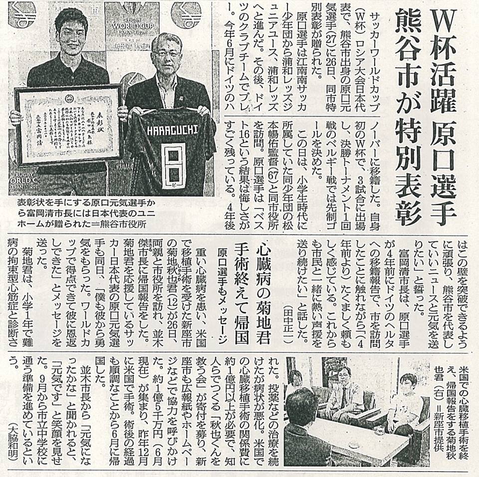 ⚽W杯で活躍し、【心臓移植】募金活動の力になった埼玉・熊谷出身の原口元気選手の記事と、秋也君の記事が載っていました。(27日 朝日新聞朝刊)