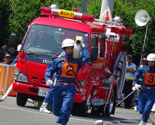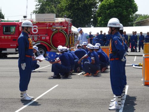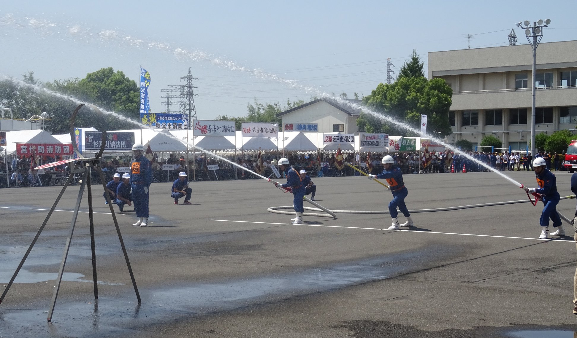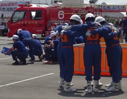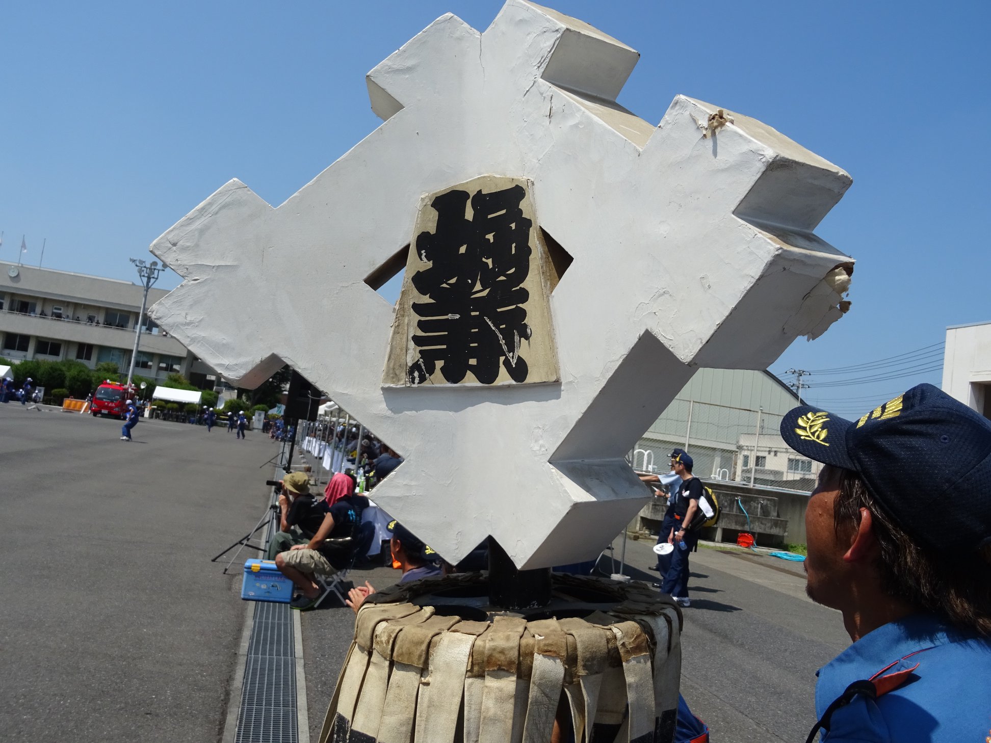 火消しの『纏(まとい)』を掲げ、消防団の団長が、出場