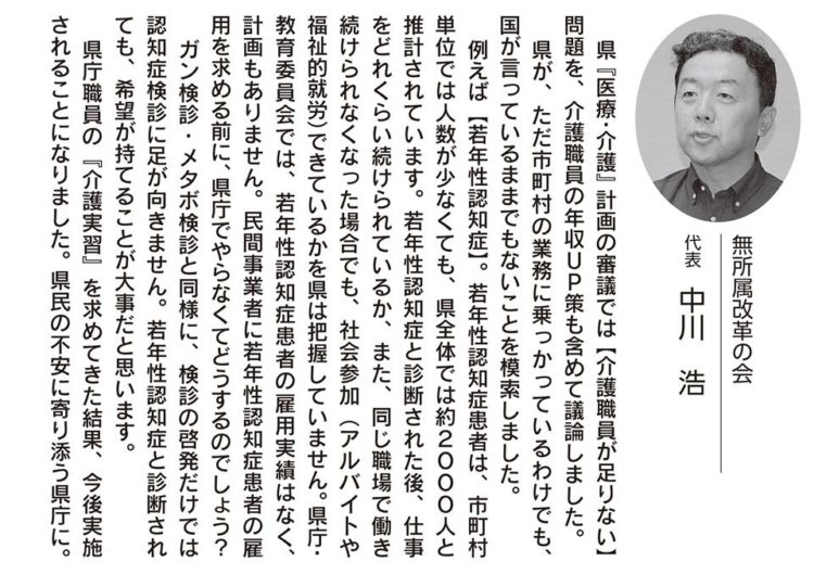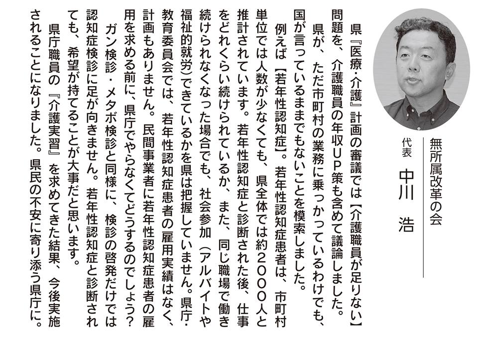 私の所属する会派は『介護心中』対策などに取り組んでいるが、県庁の取り組みは、まだまだだ。県庁・庁舎にいるだけでは、どうにもならない。
