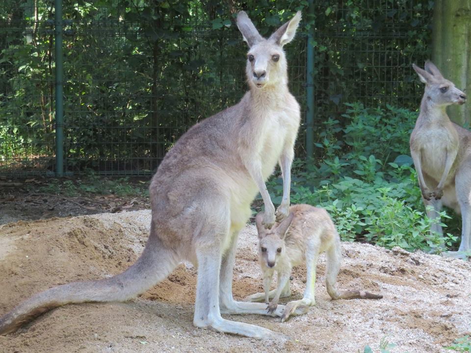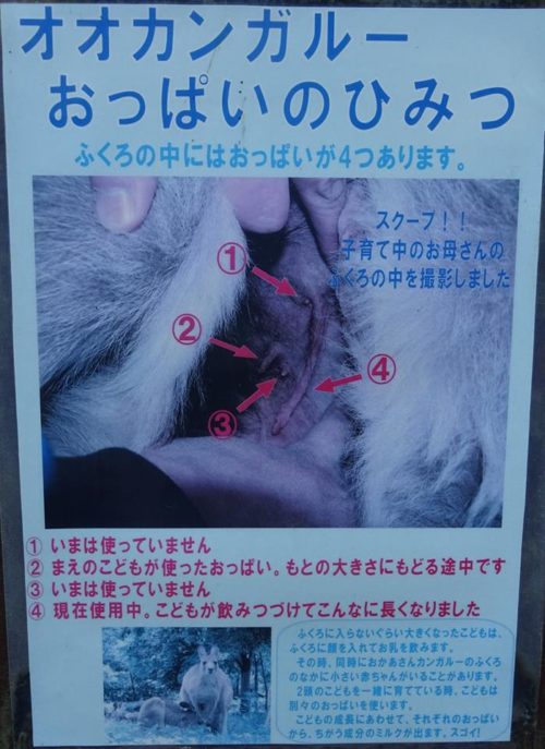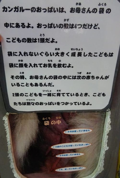 カンガルーが産むのは1頭。お母さんの袋から子供が出た後は、次の赤ちゃんが袋の中にいる事もある。そういう時は、別々のおっぱいだそうです。