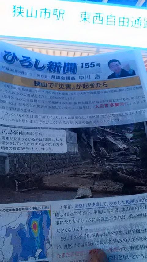 ⚡雷雨のすきを突いて、『ひろし新聞』155号を今夜は狭山市駅西口で配布。(西日本豪雨 募金のお礼を兼ねて。m(_ _)m)11時まで。