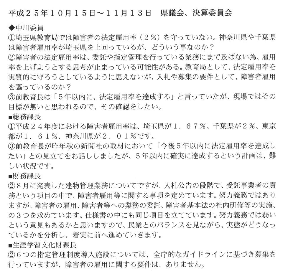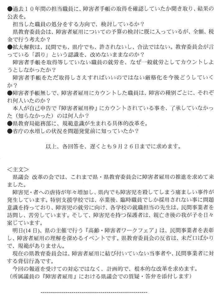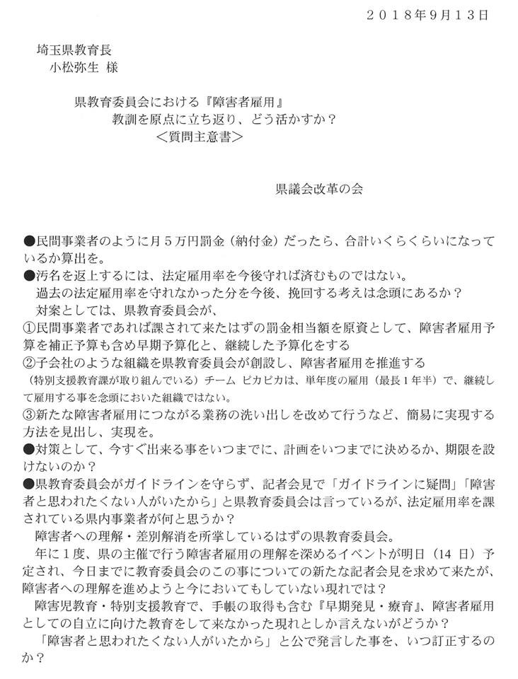 【埼玉県教育委員会の『障害者雇用』】 連日、報道されていますが、私が所属する会派で、教育長に質問書を今日提出しました(具体策も提示)。 県議会 一般質問前日の26日までに返答を求めています。(シリーズで伝えます)