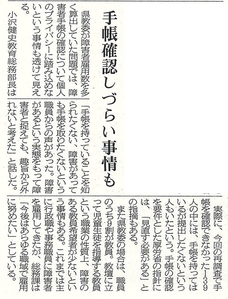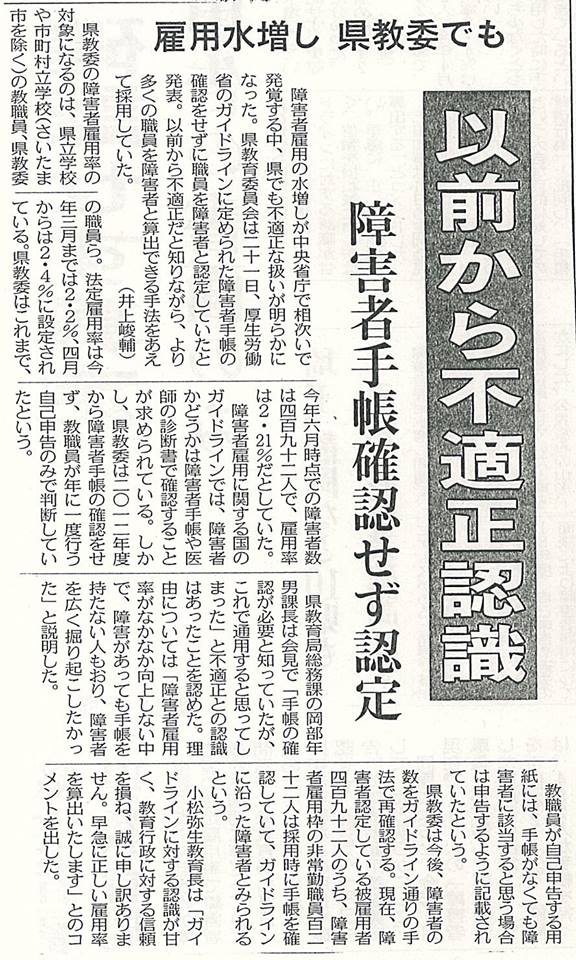 障害者の法定雇用率を、県教育委員会は、ずっと守らず、県議会で指摘して、やっと守ったと思っていたのに、裏切られた。