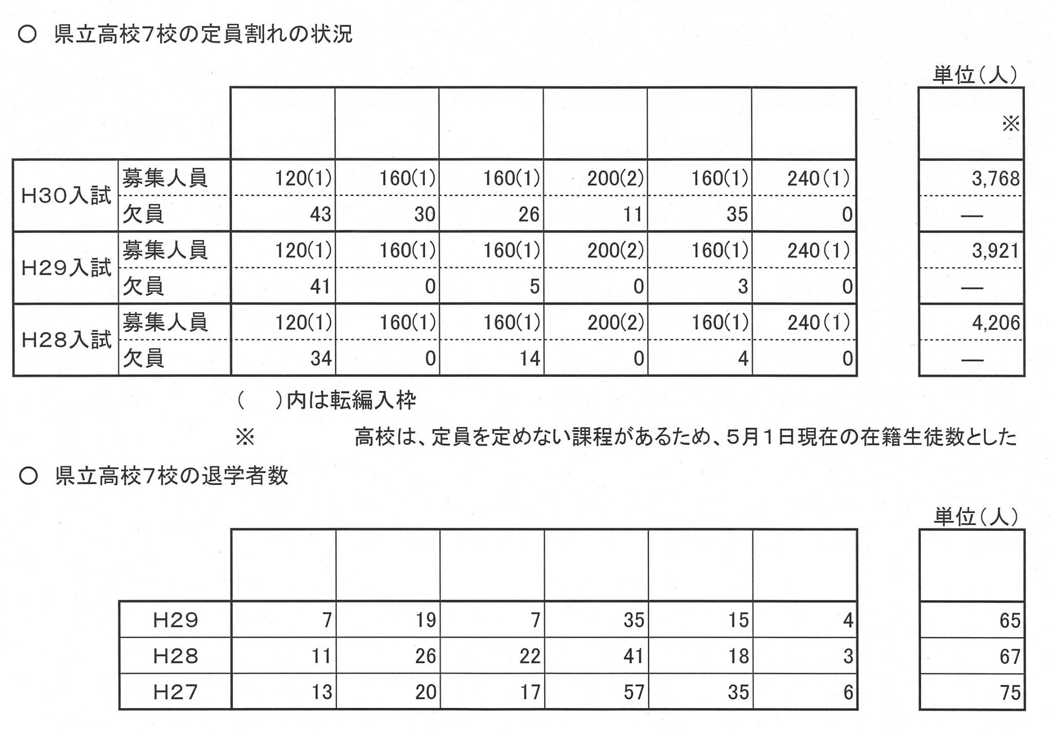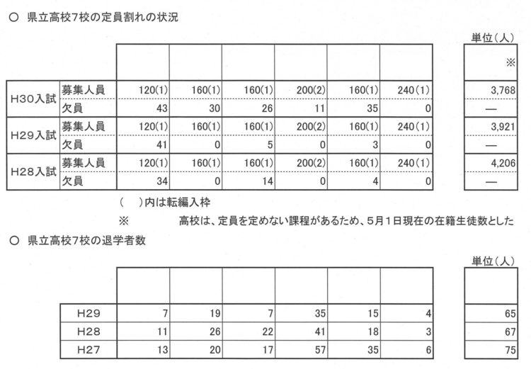 県立高校でクーラーを設置する際、保護者に負担を求めると言う。小中学校で設置する場合、負担は無い。では、なぜ7校でこれまで設置されて来なかったのか。私の仮説は、募集しても欠員と、退学者が多い傾向にあるのではないか?そこで(写真の)資料作成を依頼したら、案の定、そうだった。