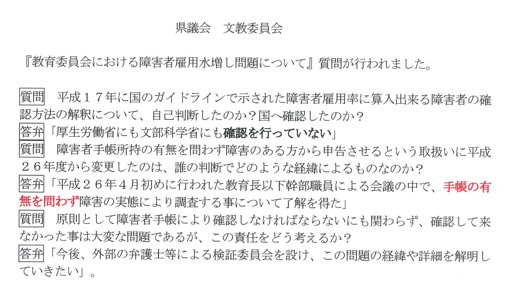 『県教育委員会の障害者雇用水増し問題』について、県議会 文教委員会で行われたやり取りの概略を報告します。