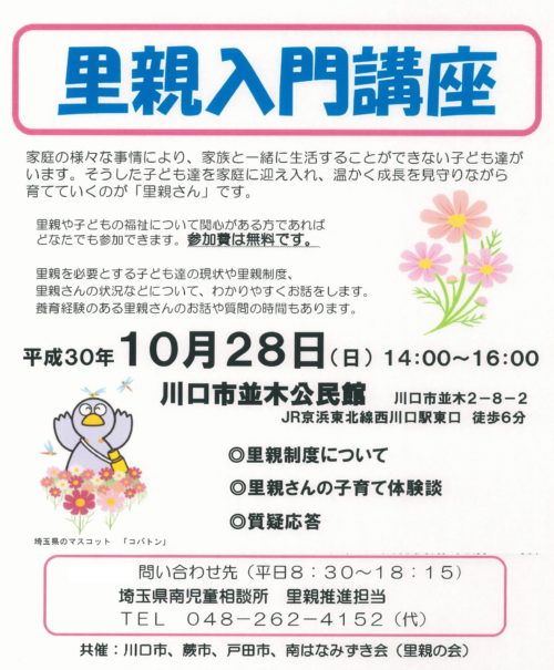 里親講座の日程 ↓ 。狭山でも今後【里親講座】が行わる予定です。日程の連絡がありましたら、報告します。