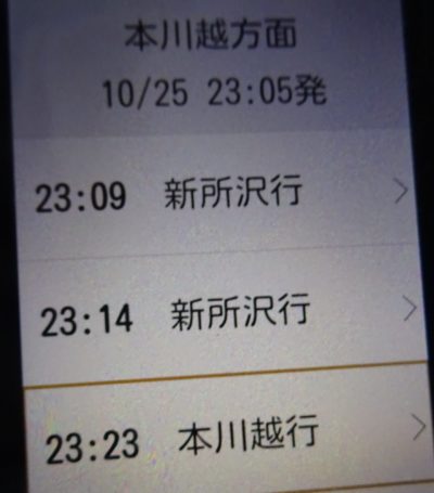 23時台の『新所沢止まり2本連続』の前後は、こうなっていて、池袋線で所沢駅に5分に着きました。
