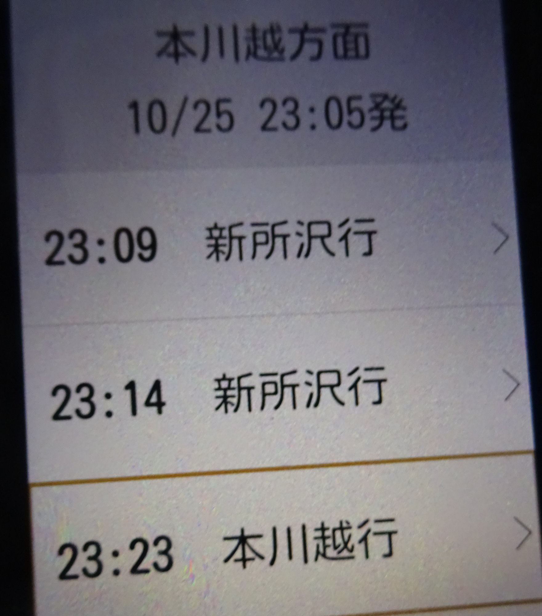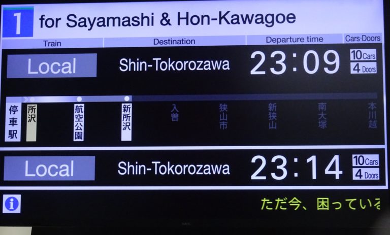 👜大荷物なので、県庁から🚊電車で帰るが、所沢駅に23時5分に着いて、狭山市まで行かない『新所沢行き』2本見送るのは、つらい。(あす始発電車の予定なんだけどな)