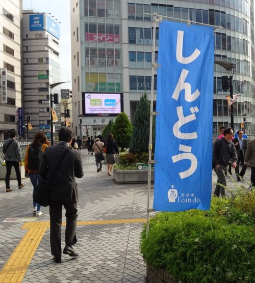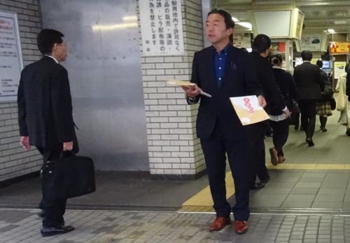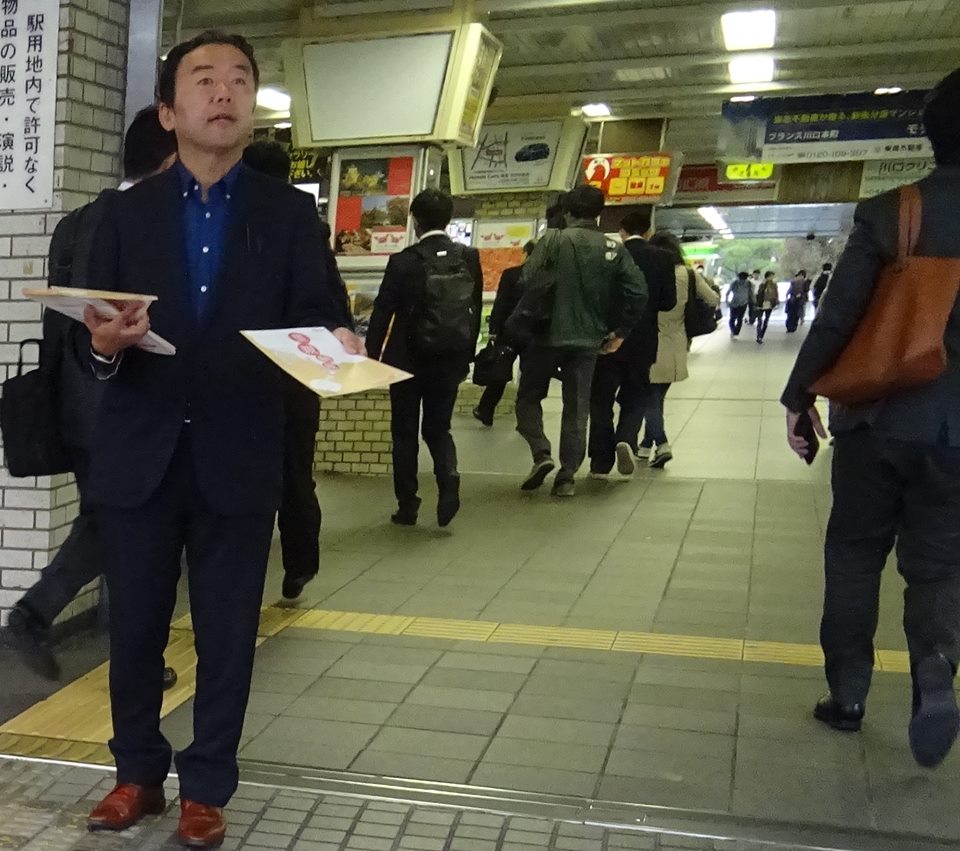 乗降客がとても多く、1秒1秒が貴重。通り過ぎた後、後ろからチラシをもらって下さる方が結構いて、有り難い。チラシをもらって頂く事もさる事ながら、一瞬で通る多くの方に主旨が分かるように何千回も地声で繰り返します。