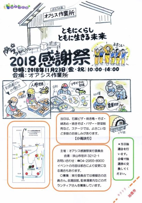 障害者施設 オアシス作業所(狭山市笹井)のイベントが23日(祝)10~2時まで行われます。