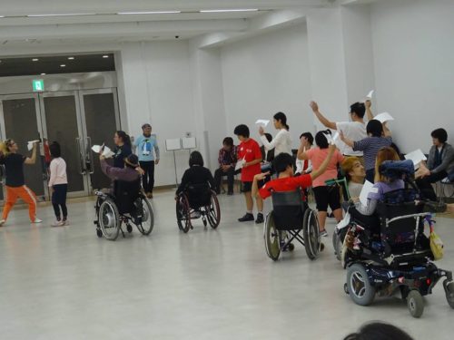 ワークショップは、ギャグを交えながら、障害のある人も無い人も、楽しく体と心を動かしてます。県の福祉部長もダンスに参加😊。