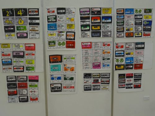 『ふせん』1枚1枚に、消しゴムで作ったスタンプを押してある。
