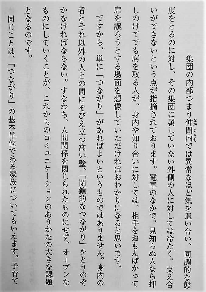 「集団の内部・仲間うちには異常なほど気をつかい合い、同調的な態度を取るのに対し、集団に属していない外側の人に対しては冷たく、支え合いが出来ない」。
