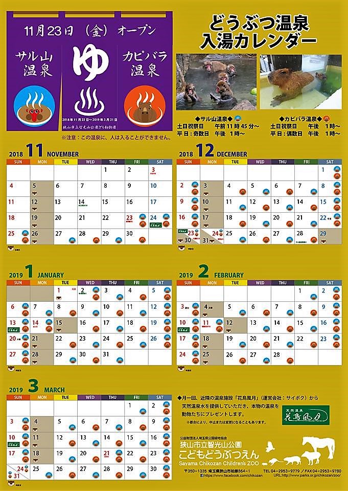 平日、奇数日がサル山、偶数日がカピバラ温泉