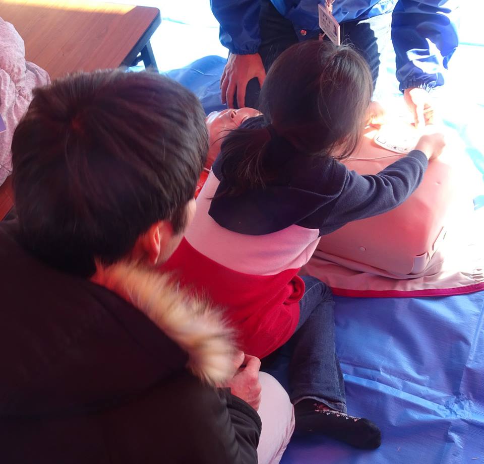🏫小学生達がバパ・ママと一緒に、心臓マッサージや、AEDの練習をしていました。子供がやっていれば、親は必ず記憶しようとします。子供の力は偉大なり。