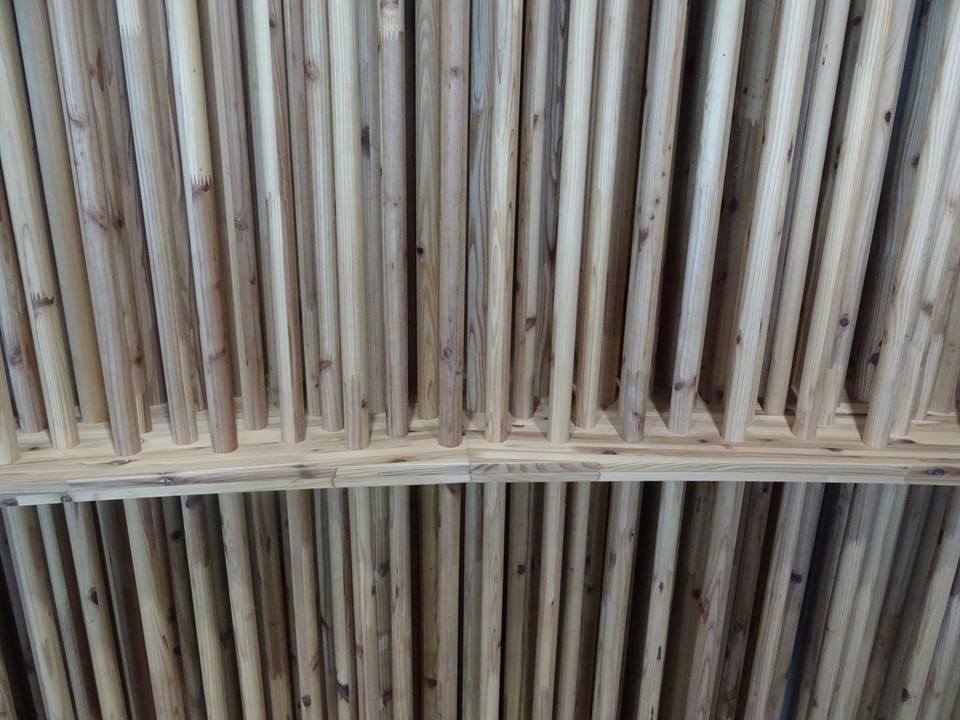 子育て支援センターの施設内の壁は、木材が何層にもなっていて、音を吸収している。