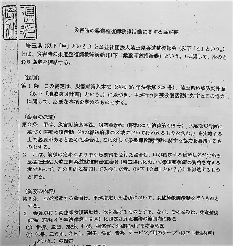 「【災害時】に接骨院で診療時間外でも軽傷の負傷者受け入れ可能な所はお願い出来ないか?病院は、重症者の対応で軽傷に対応出来ない事が予想されるので」と埼玉県の【接骨院】の団体の会長・役員さんに私からお願いし、昨年の埼玉新聞主催の新年会で、上田知事に会って頂いたところ、昨年11月に県庁と災害時の協定を結んだ(📷写真)と聞き、逆に感謝されてしまいました。こちらこそ、御礼申し上げます。1歩進みました(ネットで調べたところ、他の会派の尽力の記述もありました。担当課に聞いたのですが、回答が得られませんでした)。