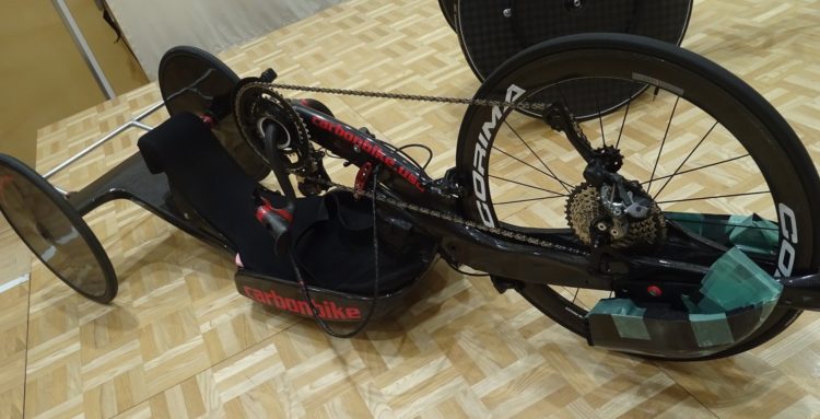寝そべるように座り、腕でこぐ【車イスレース】のタイプ。