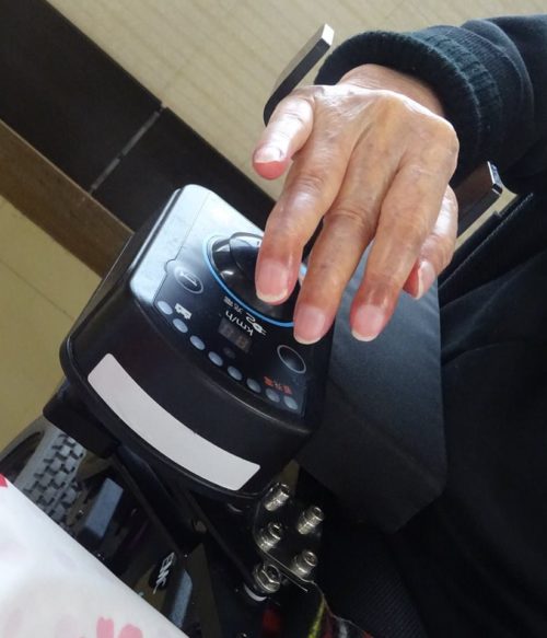 事故で頸椎(けいつい)を損傷した方にも、ゆっくりお話を伺い、ある方の『電動車イス』は、バーを握って操作するタイプではなく、手をそえて動かすタイプでした(📷写真)。障害の状況は人によって違うので、お話を伺う事で分かる事があります(伺った話は省略)。イベントの時は毎年のようにお邪魔していますが、普段のほうが様子が分かりますね。職員の皆さんも含め、ありがとうございました😊。(許可を受けて撮影しています)