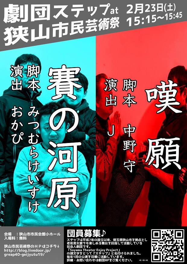 あす(土)【市民劇団】公演 短編2本! 入場無料 公演①『嘆願』 とある夫婦がどうしてもかなえて欲しい願いとは? ②『賽の河原』 賽(サイ)の河原に現れた二人の男、無事に三途の河を渡り、あの世に行く事が出来るのか? 狭山市民会館小ホール 午後3時15分〜(30分)
