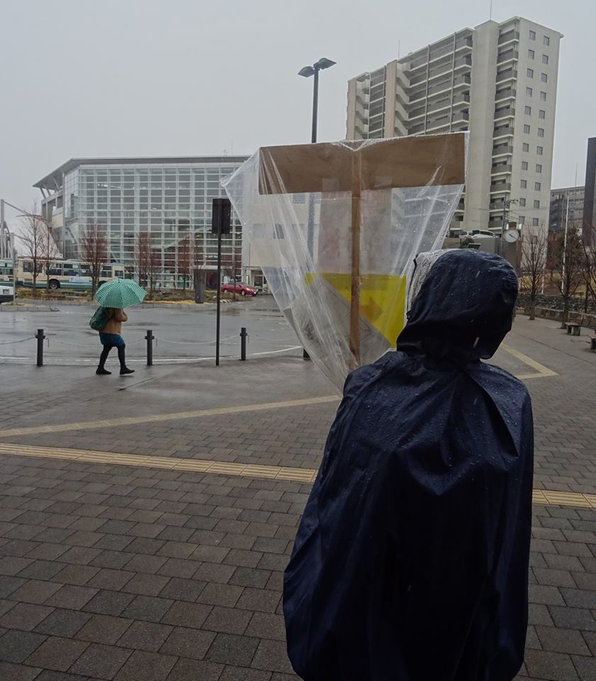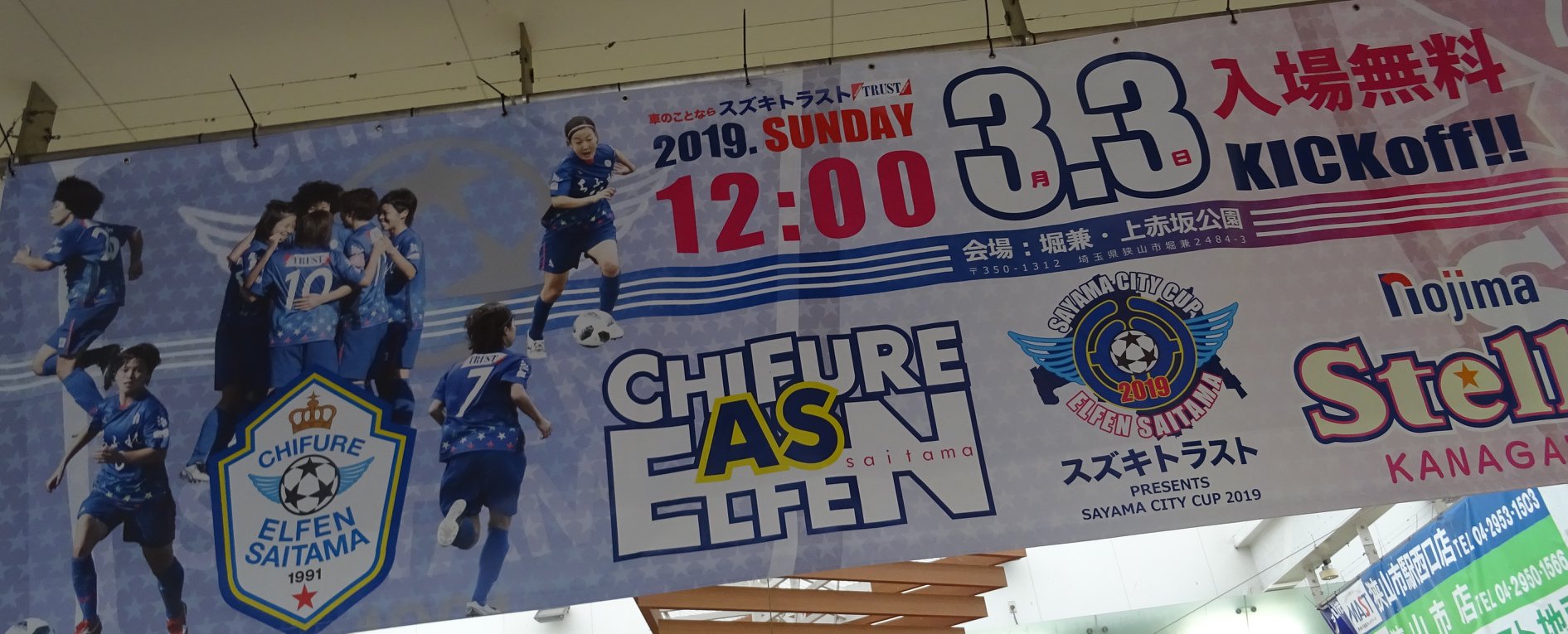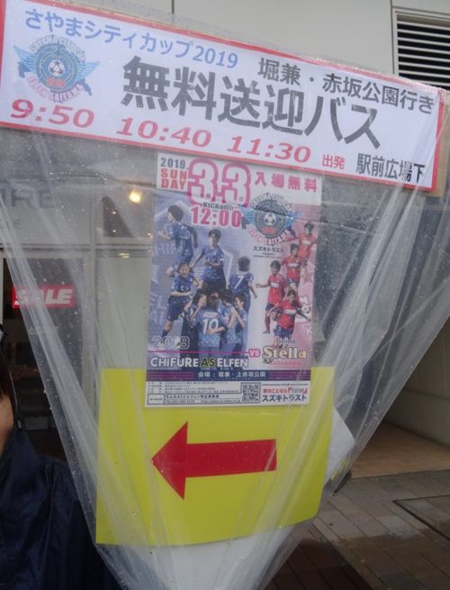 ☔雨の降りしきる中、⚽日本女子サッカー・なでしこリーグ『エルフェン埼玉』の試合が狭山で今日(日)12時から行われる為、無料送迎バスの案内で、3人の方が駅前に立っていました。