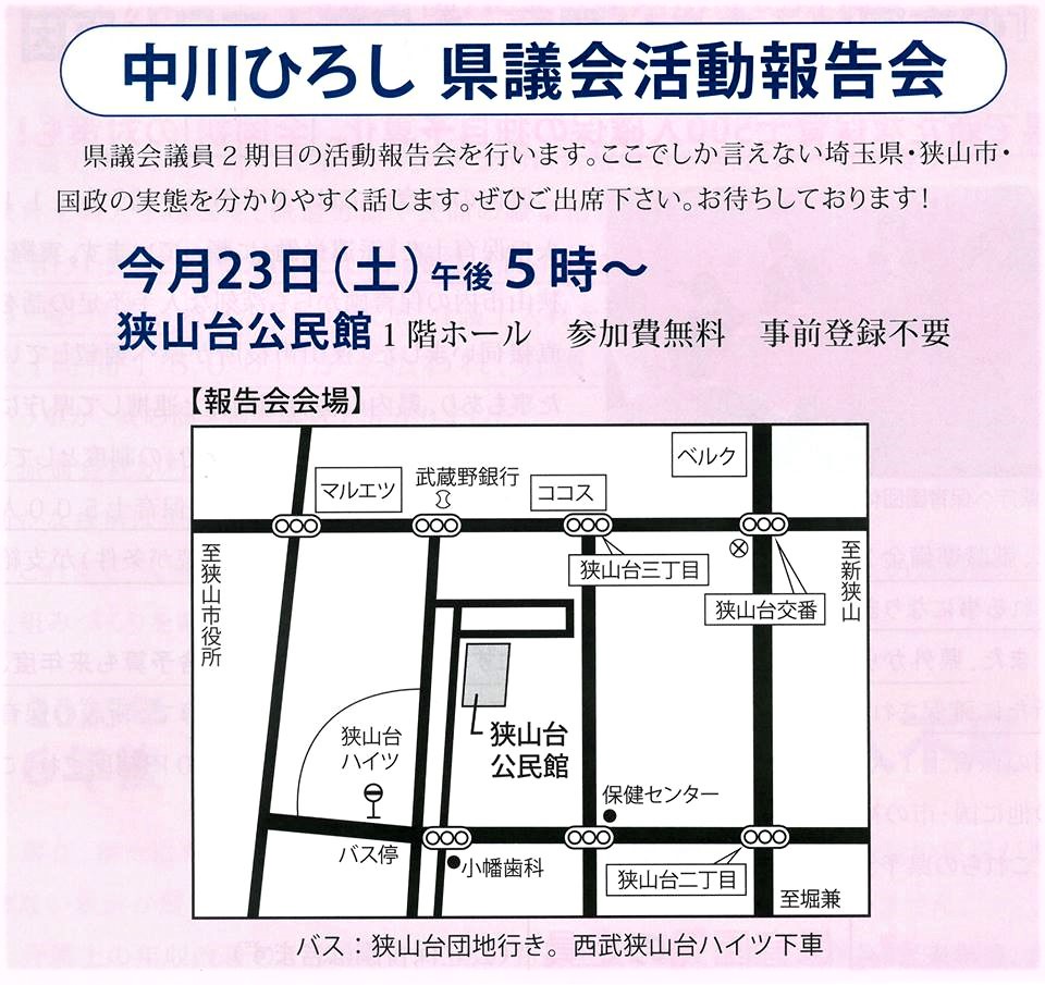 【中川ひろし 県議会活動報告会】 今度の土曜(23日)午後5時~ 狭山台公民館1階ホール 県議会議員2期目の活動報告会を行います。 ここでしか言えない埼玉県・狭山市・国政の実情を分かりやすく話します。ぜひご出席下さい。お待ちしております☺!(駐車場が満車の場合、武蔵野銀行か、マルエツのコインパーキングにお停め下さい)