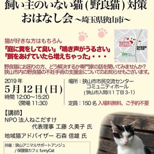 狭山市内の自治会(下広瀬)の地域猫活動の報告もあり、「困っている人が、猫を見てイライラしなくなった」とおっしゃっていました。狭山市内の募金によって、43匹の避妊手術が出来たとの事。講演会終了後、主催団体のご好意で講演者・スタッフの方々に詳しくお話を伺って、現在の社会(高齢化・ゴミ屋敷・核家族の孤立など)の『人助け・ネコ助け』だと思いました。ボランティアの方から県への提言を頂いたので、今後ボランティアさんと動いていきます。