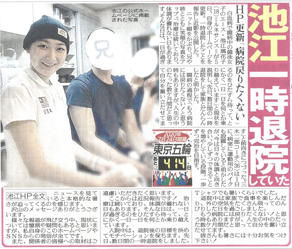 🏊池江選手、一時的に退院し、自宅や、大学の水泳部にも顔を出せたとの事。