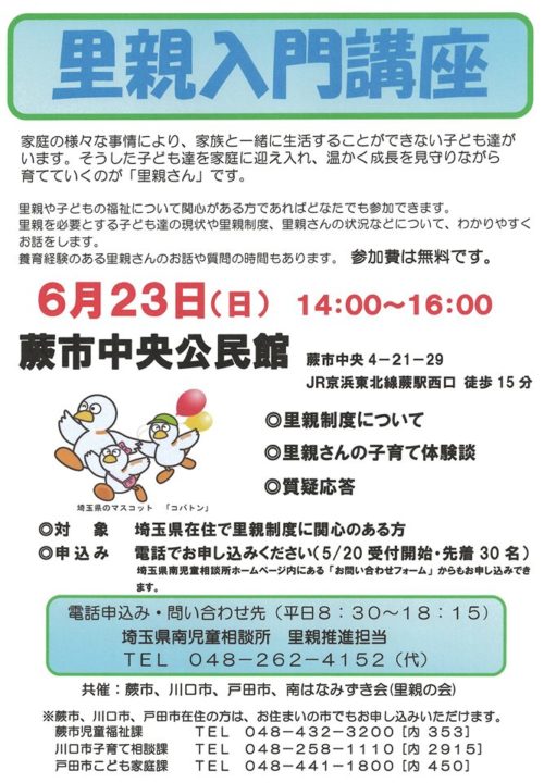 【里親入門講座】 蕨市で今度の日曜・23日に開催
