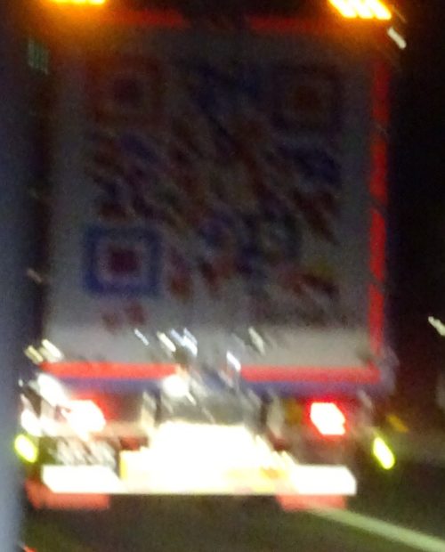 面白い🚚トラックを見ました。後ろのドア全面がQRコードになっていて、後ろだけ見ると何の会社だか分からず『運転中のスマホは禁止ですよ~』って書いてありました☺。何の会社か知りたくなって、🚕停車中に思わず📱スモホをかざす車がありそう。