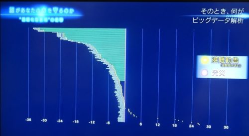 (📷写真は) 豪雨災害が起きた137地区のうち、 『避難指示』が出てから災害が起きる(縦の中央の線)までに2時間以上時間のあった地区は、緑線の時間軸。